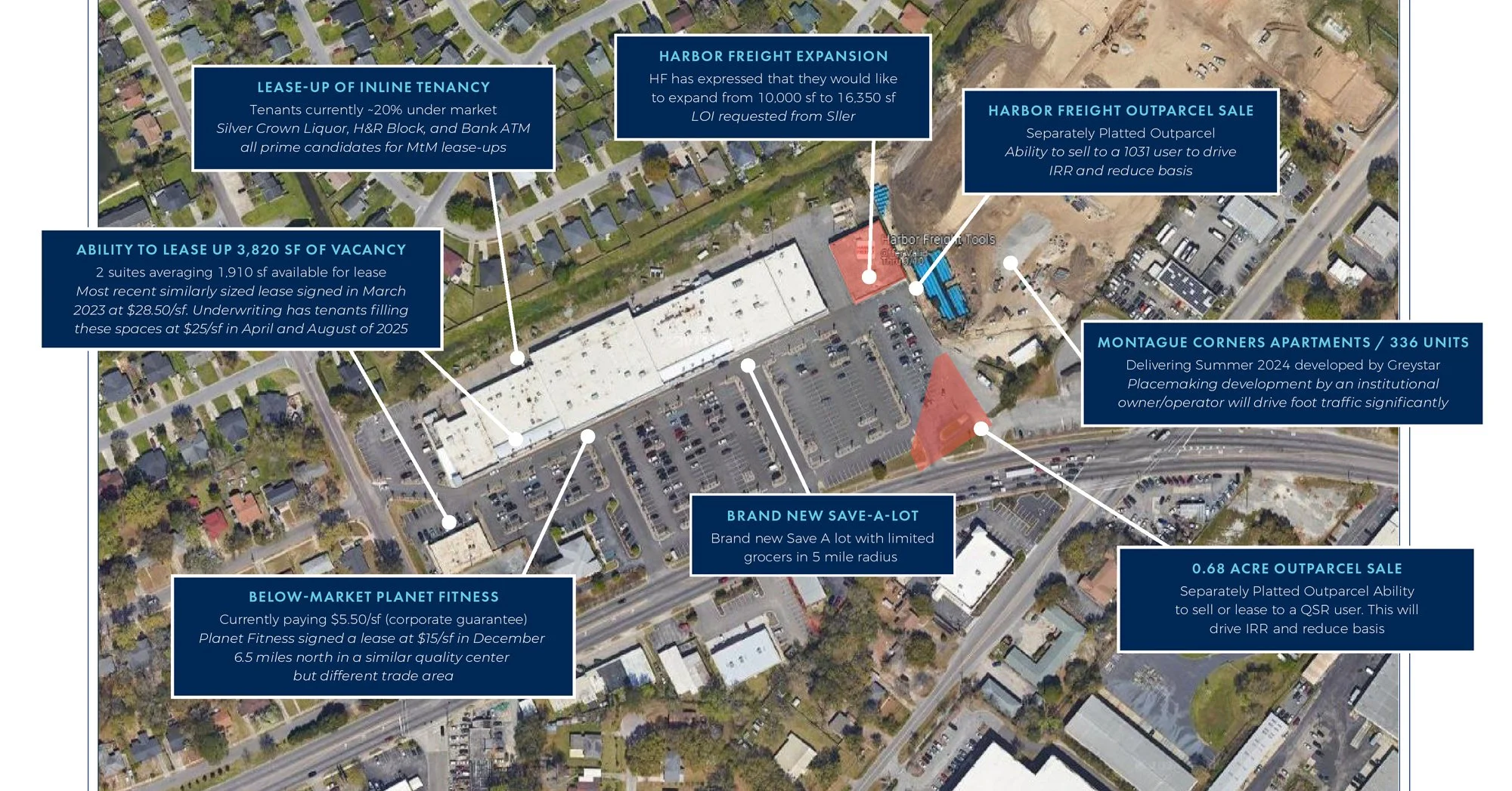 Renovation work included a new building façade, restriped and resealed parking lot, and significant landscaping upgrades. The Property benefits from strong visibility and accessibility along Dorchester Road, a heavily trafficked retail corridor with over 28,200 vehicles per day (“VPD”). The property's location, just 0.5 miles from Interstate 526 (79,700 VPD), provides outstanding regional connectivity. The in-place rent roll is 18.0% below market, with a WALT of 3.47 years, presenting an opportunity for long-term leasing upside through mark-to-market leasing activity. The acquisition of Montague Corners presents a compelling opportunity to purchase a well-located grocery anchored center in a high-growth submarket with no new retail supply and a booming population.